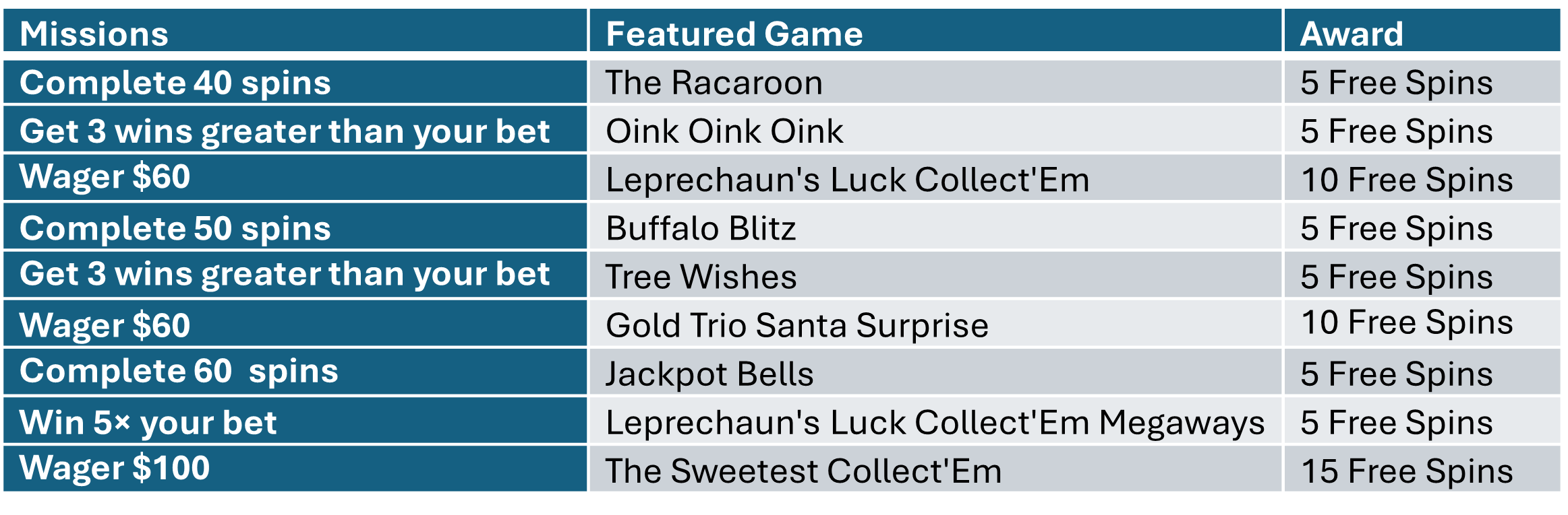 How It Works: Players can earn up to 65 Free Spins by completing Missions! Missions can only be completed once and in any order.