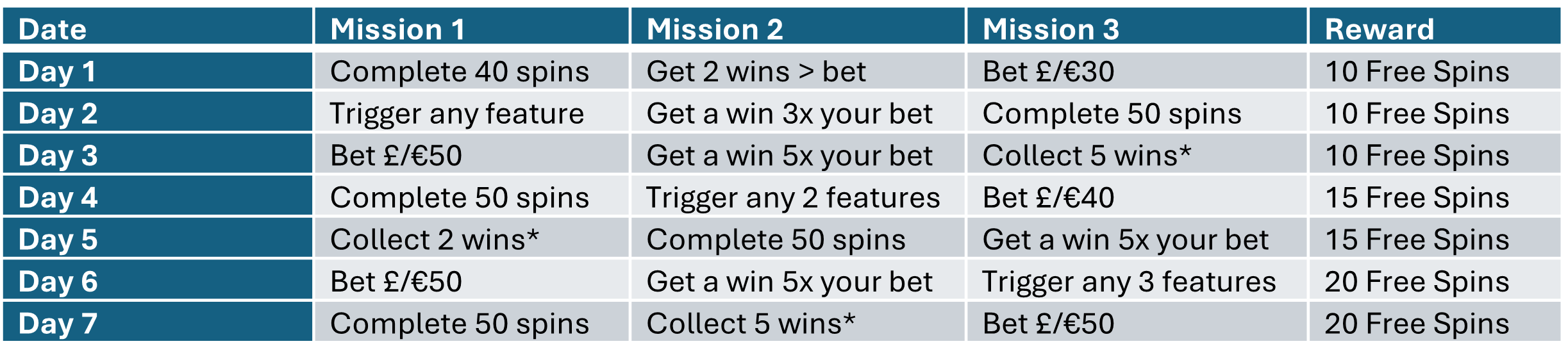 How it works: Players can earn up to 100 Free Spins by completing Missions! Missions can only be completed once and in any order.