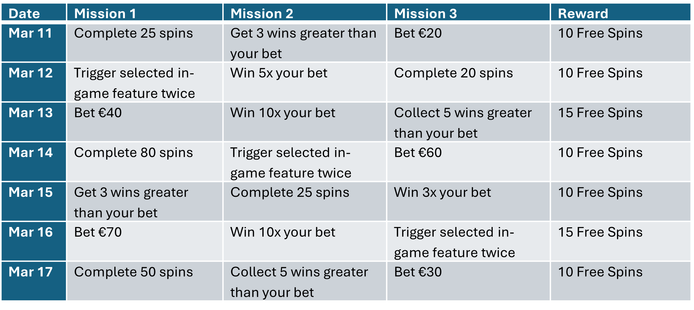 Players complete 3 missions per day for 7 days, unlocking Free Spins and prizes. Weekend missions are tied to Engagement Games for extra fun.