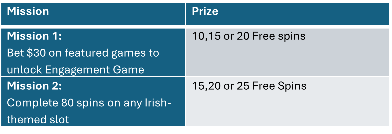 Players complete 3 missions per day for 7 days, unlocking Free Spins and prizes. Weekend missions are tied to Engagement Games for extra fun.